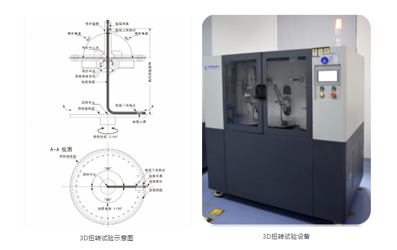 在SCARA机器人中,波纹管中的电缆随关节运动,承受扭转应力。部分电缆在型式试验中会参考电缆测试标准进行试验,例如在TUV标准中,扭转角度±180度,扭转长度为300mm,扭转次数500万次。而在机器人实际使用中,扭转角度由关节最大运动范围和电缆安装长度决定,可能使用条件比厂商扭转条件严苛,因此需根据实际工况制定扭转角度/长度/次数进行试验。