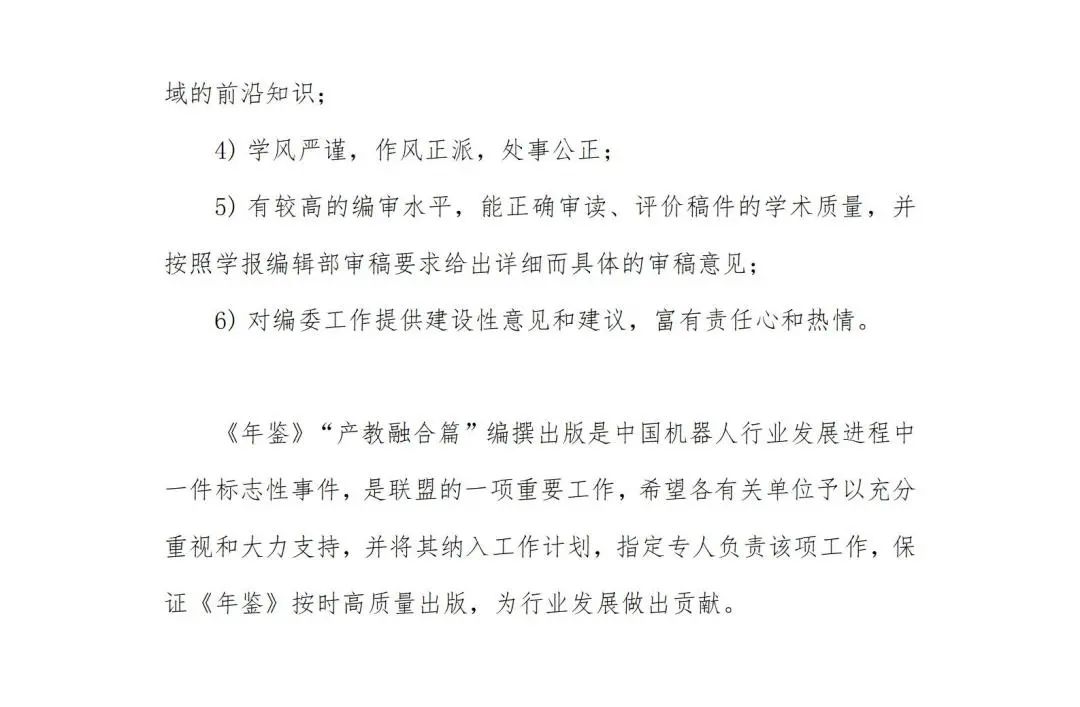 《中国机器人工业年鉴 2023》(以下简称年鉴)征稿工作正式启动,并将于今年 12 月由机械工业出版社正式出版发行。《年鉴》内容涵盖工业机器人、服务机器人(包括特种机器人),共设置综述篇、大事记、产业篇、创新篇、地区篇、园区篇、标准检测认证篇、产教融合篇、企业篇、应用篇、人物篇、政策篇、国际篇、统计资料、 附录等十五个篇章。《中国机器人工业年鉴 2023》产教融合篇将由中国机械工业联合会机器人分会教育培训工作组(原中国机器人产教融合联盟)组织撰写。